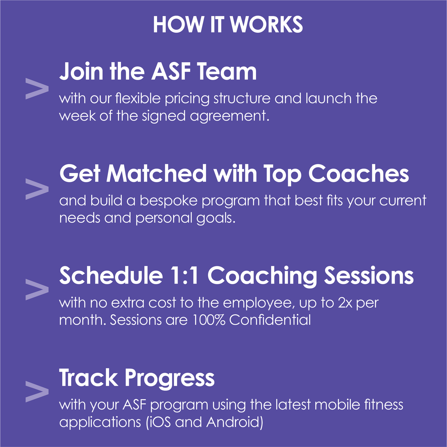 Schedule 1:1 virtual coaching sessions up to 2x per month at no additional cost to your monthly fee. Track progress, get feedback, and optimize your program on the go with the ASF team.